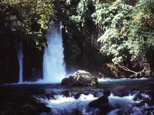 Pagan Paneas — modern Banias — the Grotto of Pan. In the foreground is the River Jordan, whose headwaters are found here.